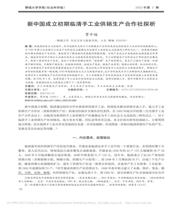 学术简报丨贾中福:新中国成立初期临清手工业供销生产合作社探析